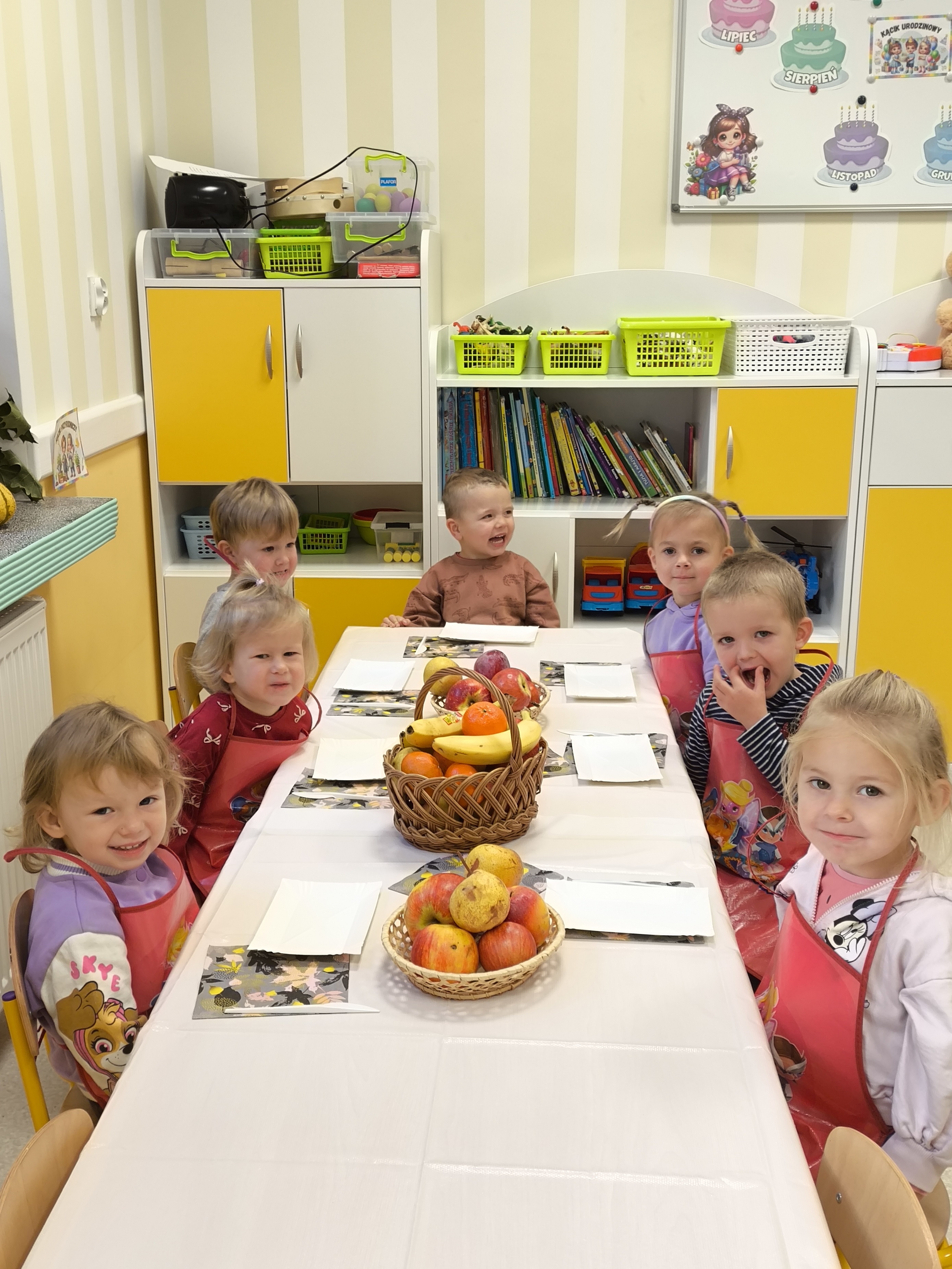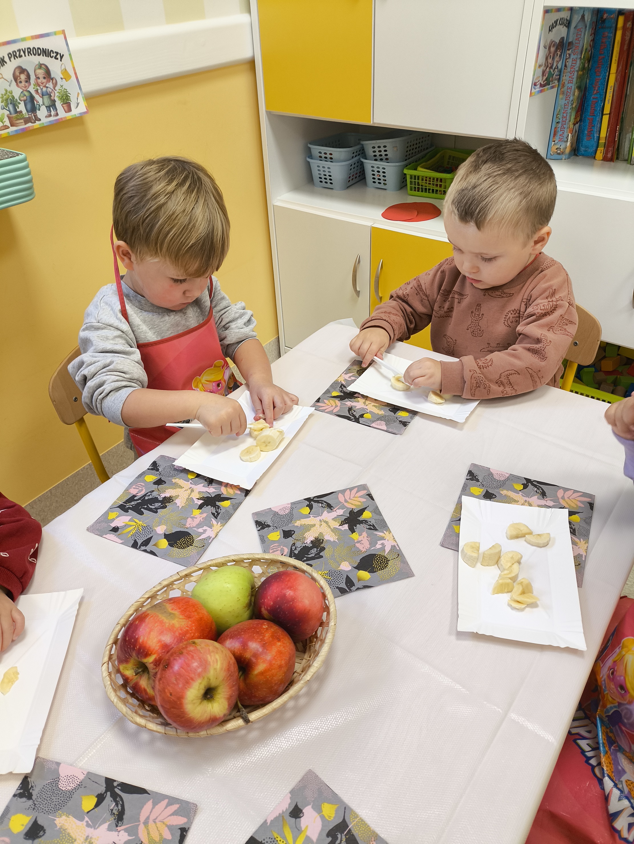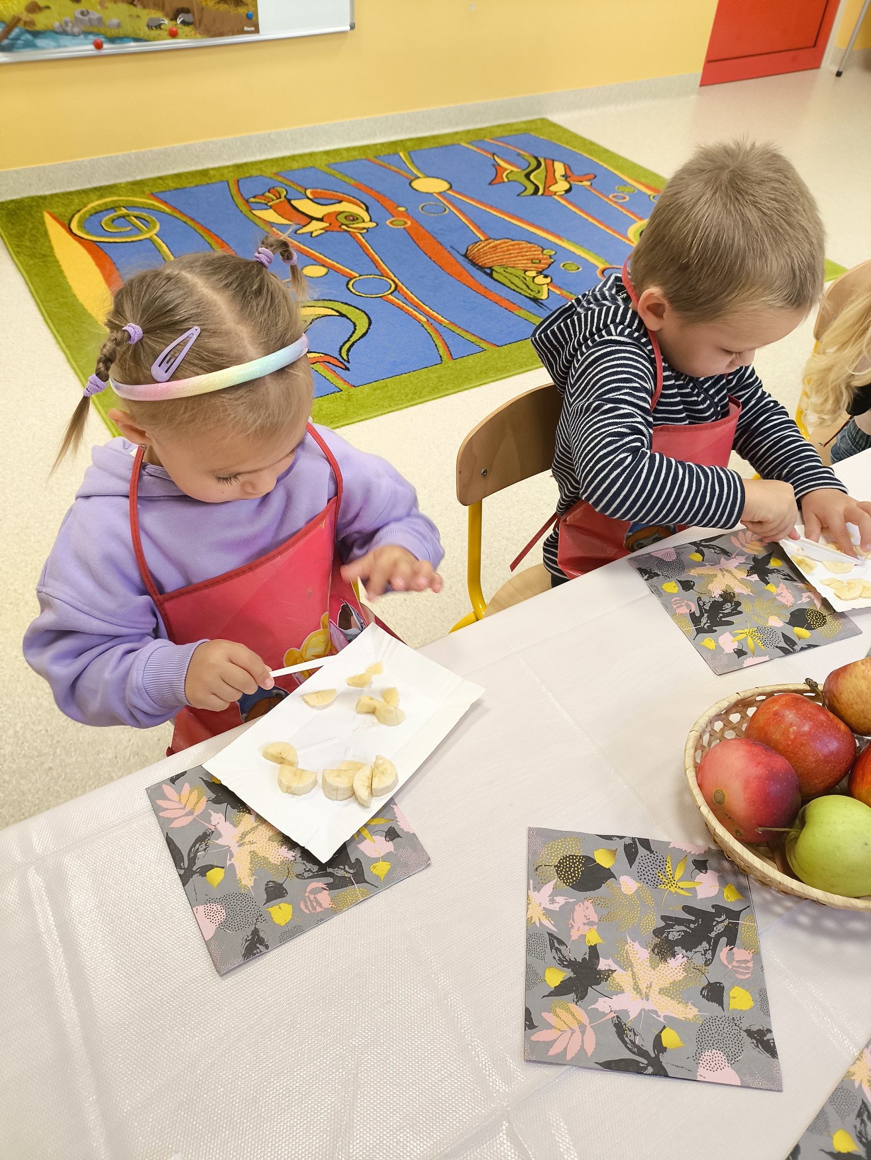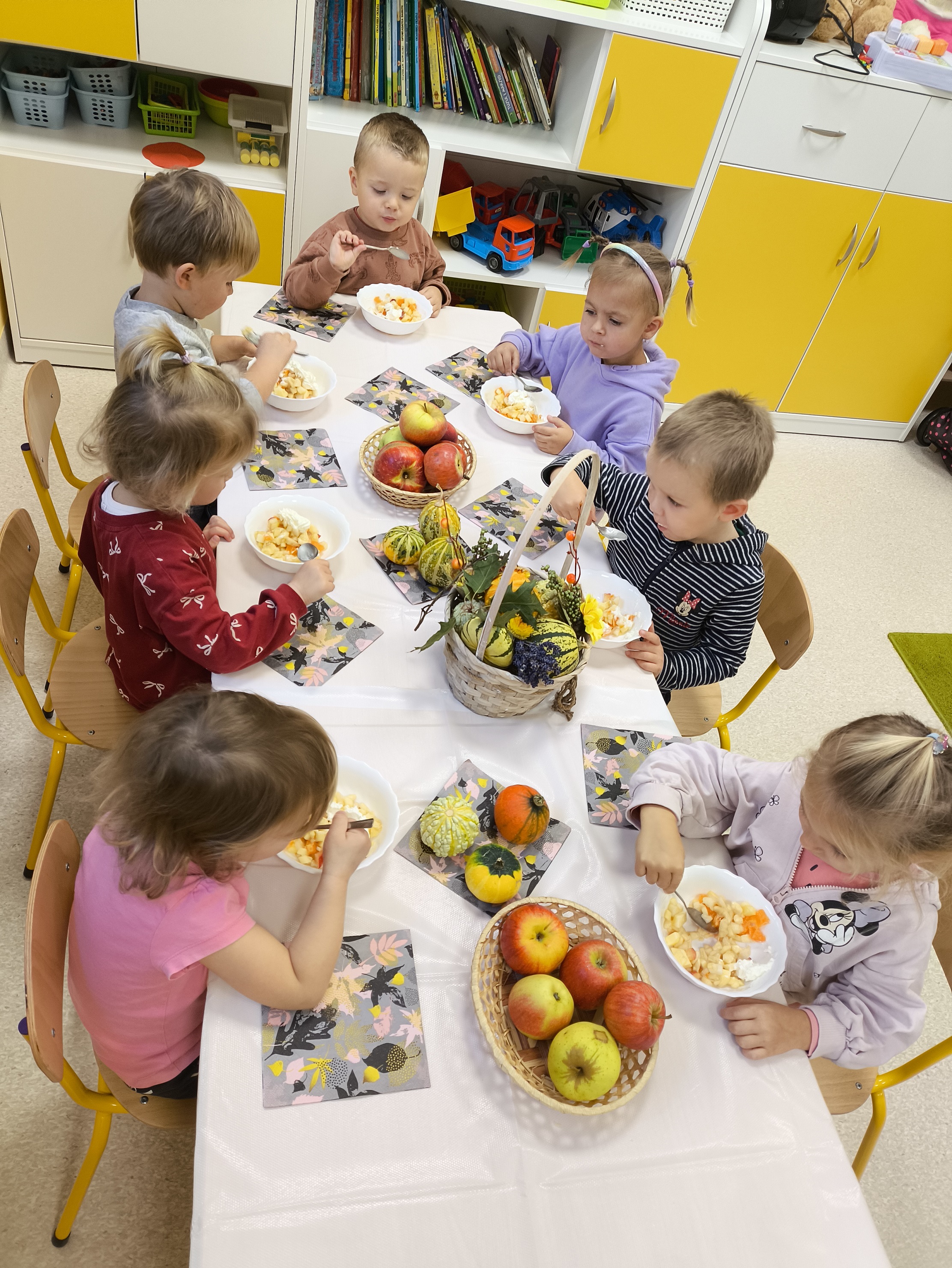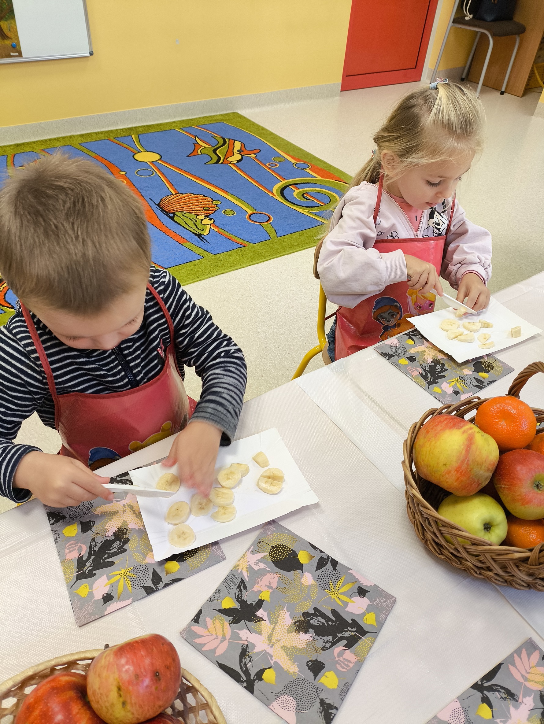 W dniu 2.10 2025 dzieci wykonały na zajęciach pyszną, witaminową sałatkę. Przyniosły z domów różne świeże owoce. Były m.in. jabłka, gruszki, banany, mandarynki, kiwi i truskawki. Wszyscy mieli soczyste minki na widok tak smakowitych owoców i każdy ochoczo zabrał się do pracy. Każde dziecko dostało tackę, nożyk oraz miseczkę. Dzieci samodzielnie kroiły i przyrządzały sałatkę owocową przestrzegając zasad bezpieczeństwa przy posługiwaniu się nożem. Własnoręcznie zrobiona sałatka wyśmienicie dzieciom smakowała. M. Marks