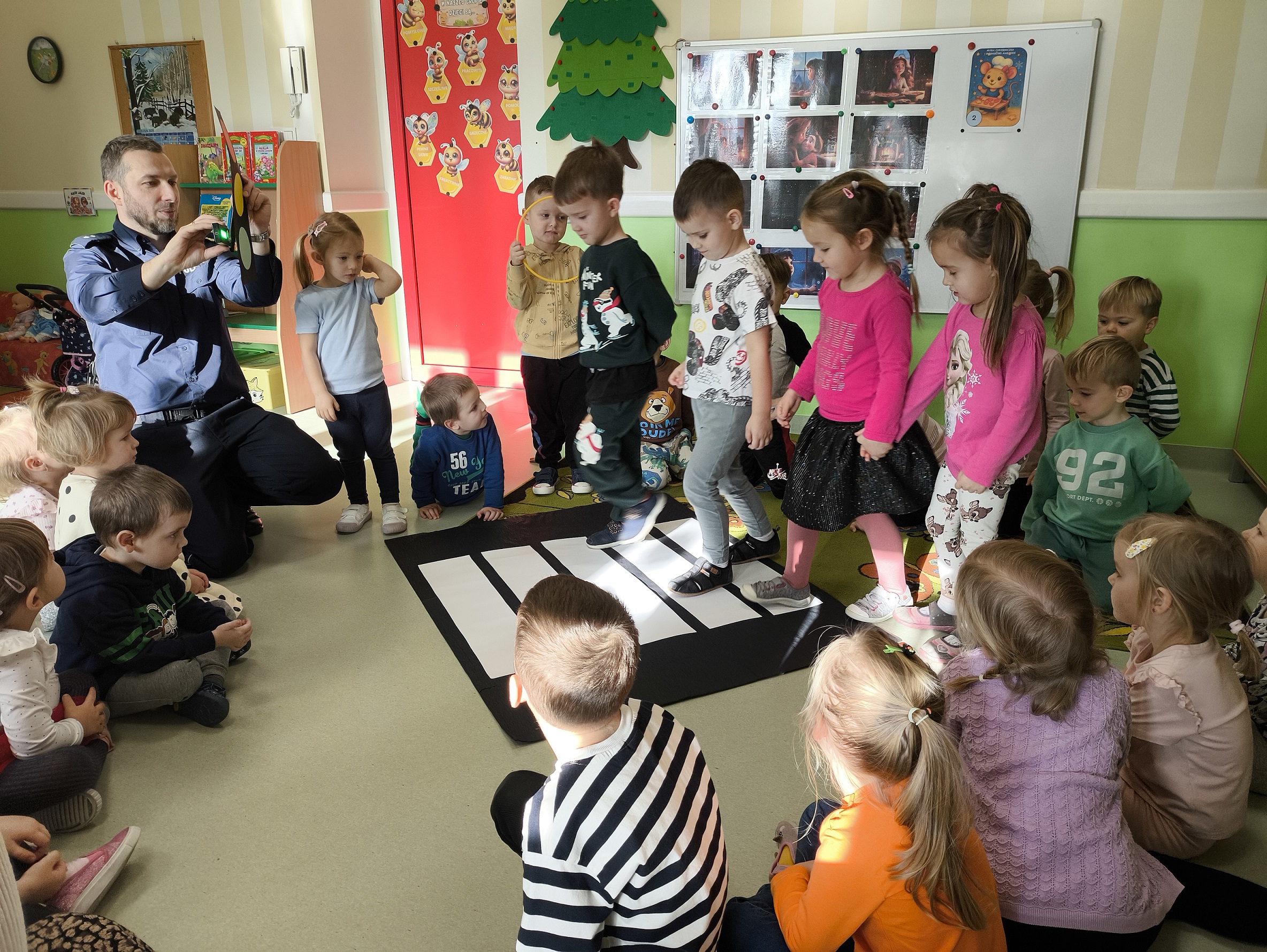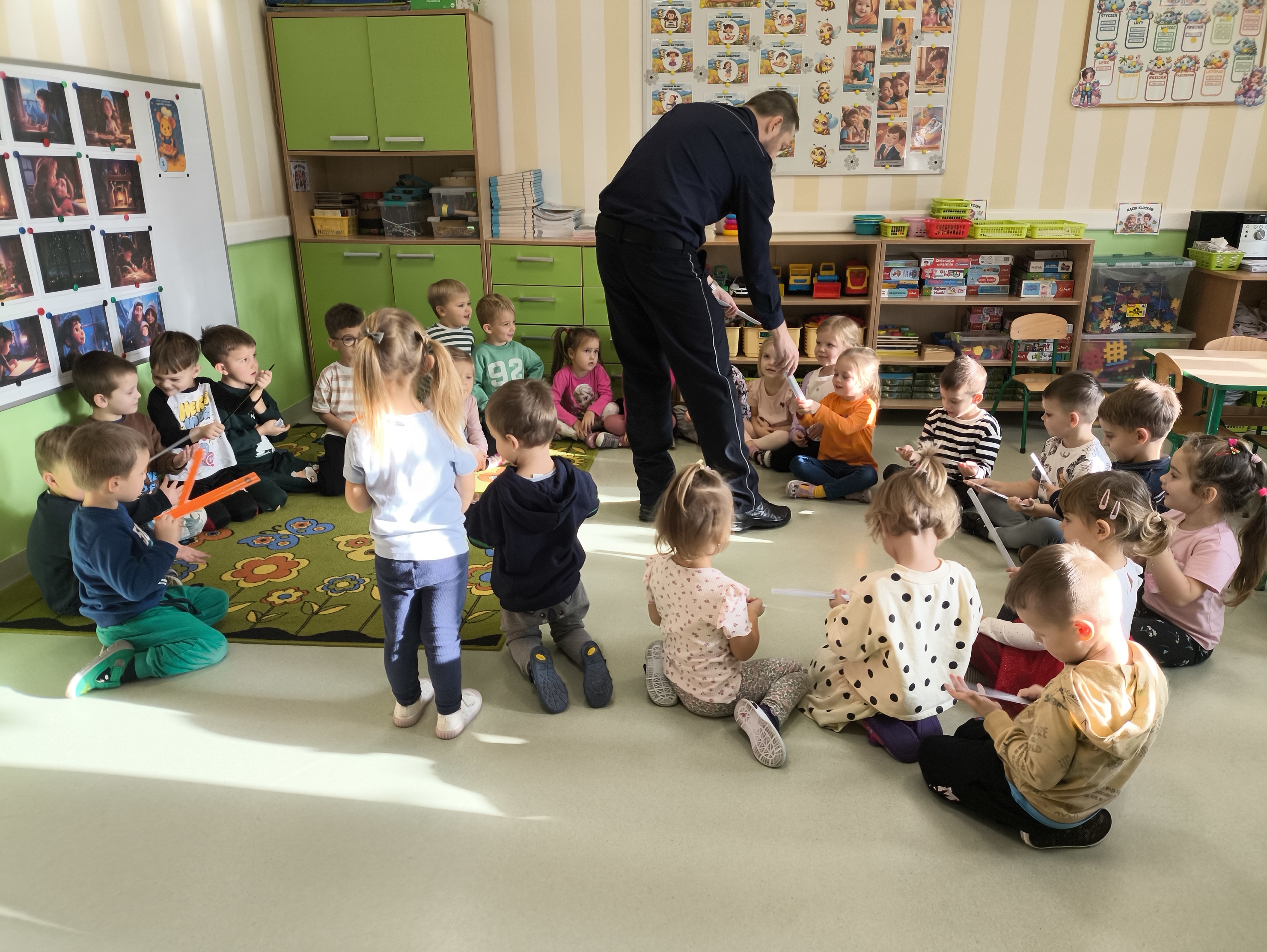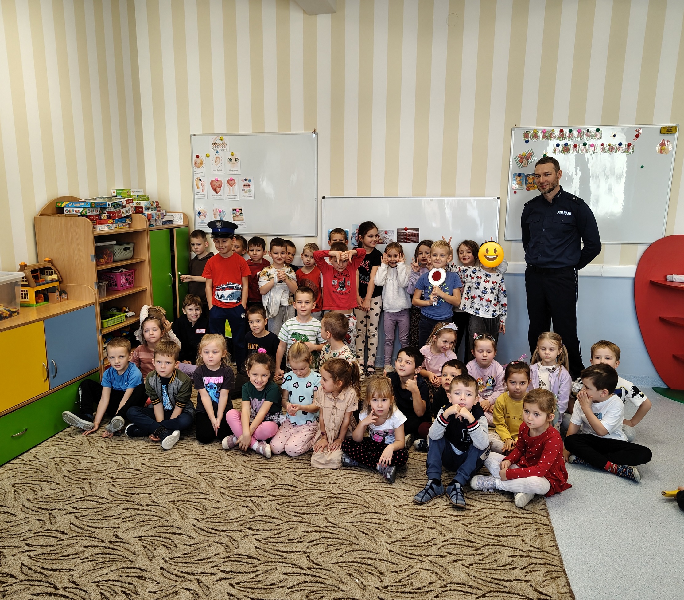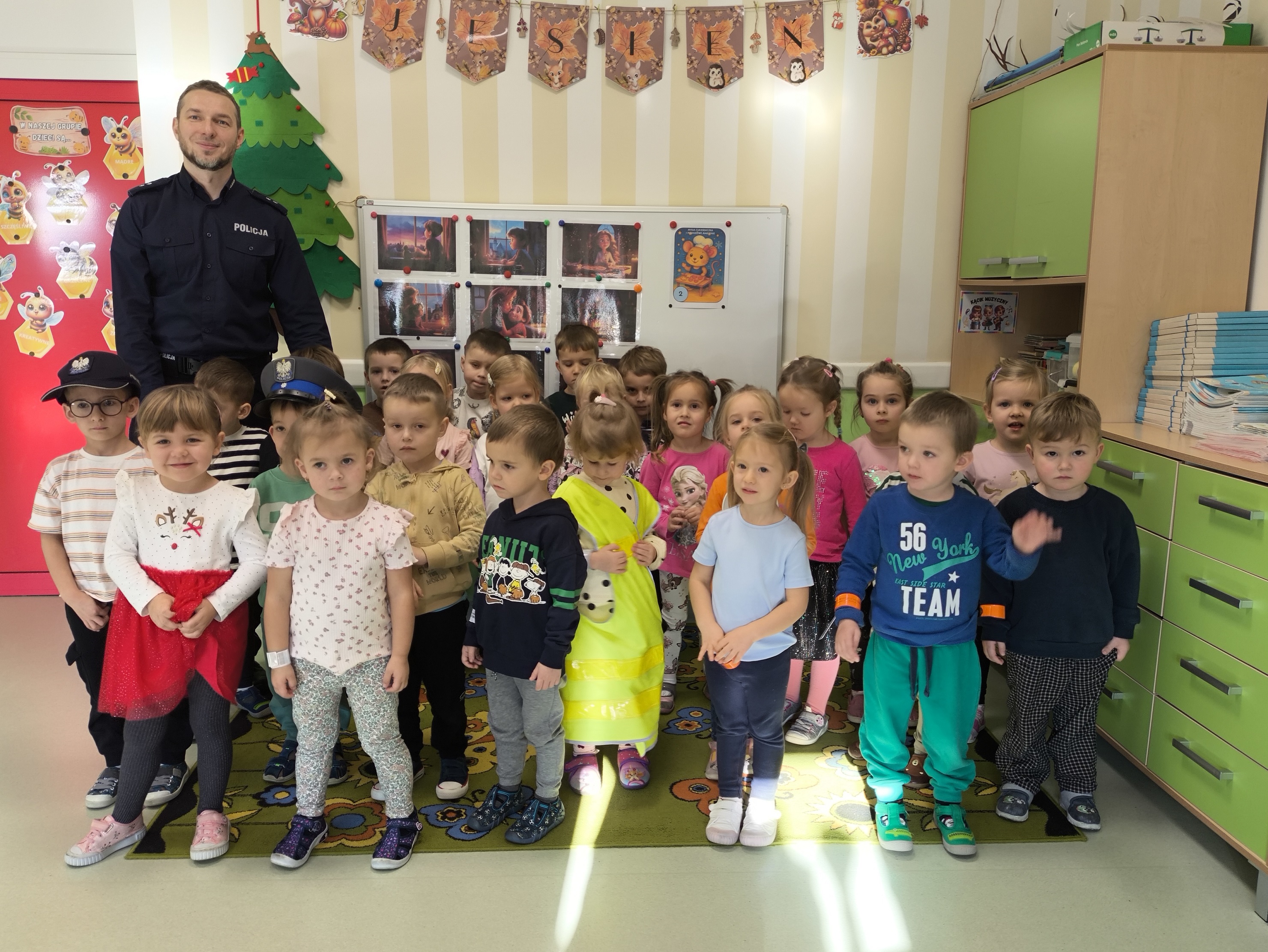 Dnia 2 grudnia nasze przedszkolaki odwiedził Pan Policjant. W spotkaniu najpierw uczestniczyły „Motylki i Pszczółki”, a potem „Biedronki i Żabki”. Dzieci poznały zasady ruchu drogowego, co wskazuje sygnalizator świetlny, a także jak ważne jest bezpieczeństwo na drodze. Podczas spotkania przedszkolaki uczestniczyły w zabawie, dzięki której utrwalały zdobytą wiedzę. Był to dzień pełen ciekawych i cennych wiadomości. M. Marks