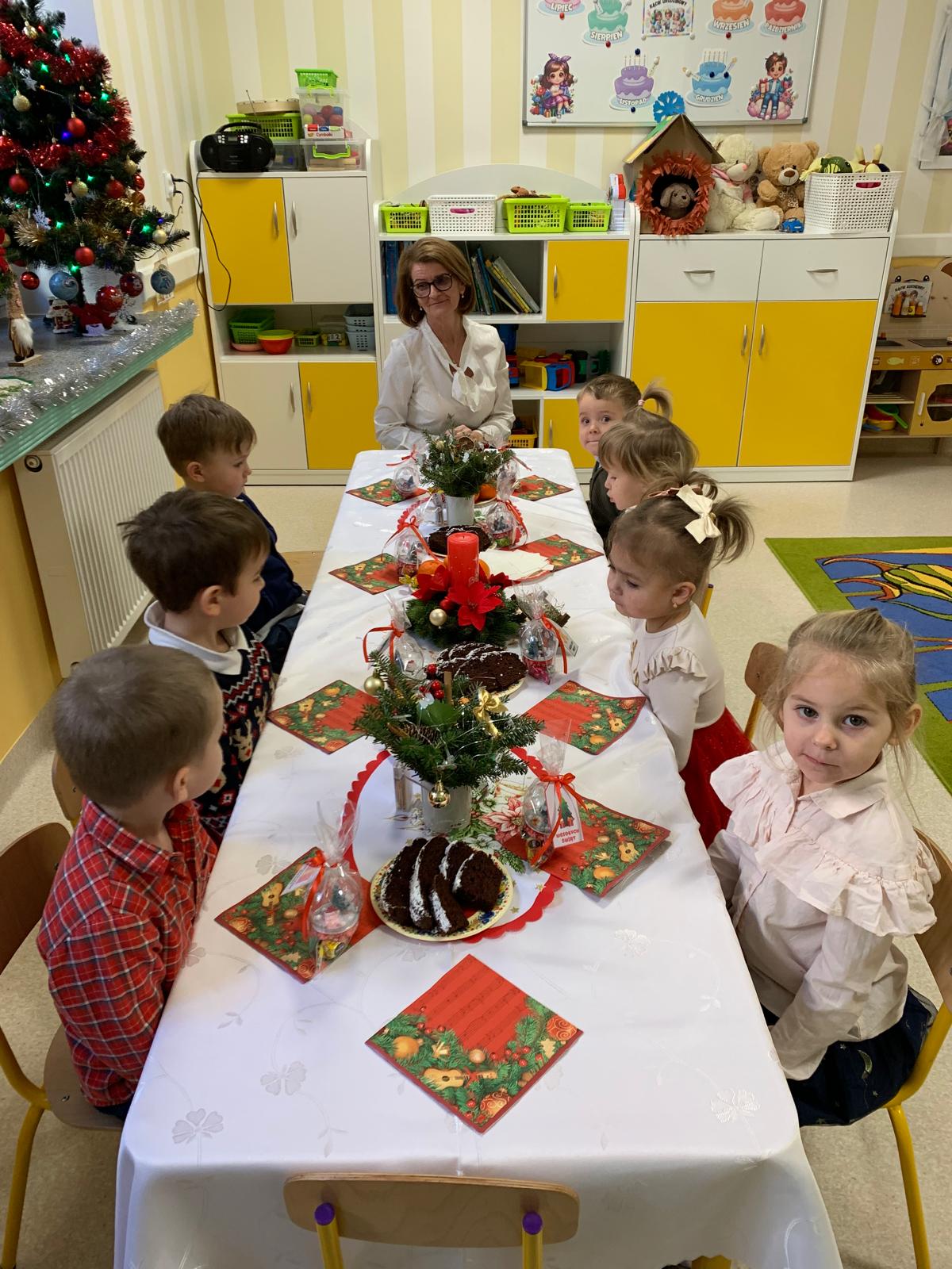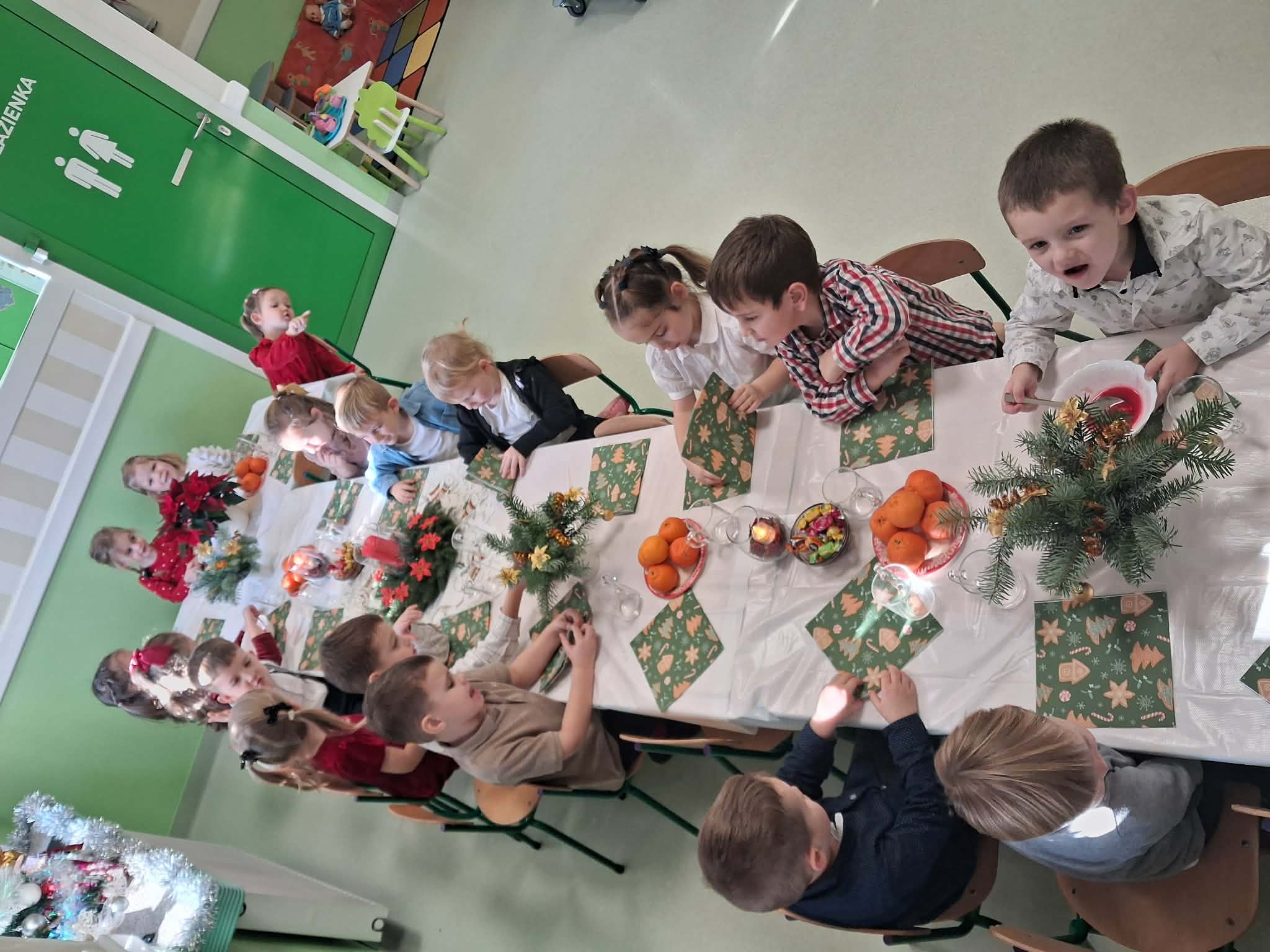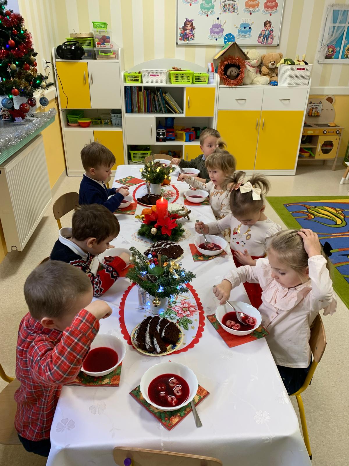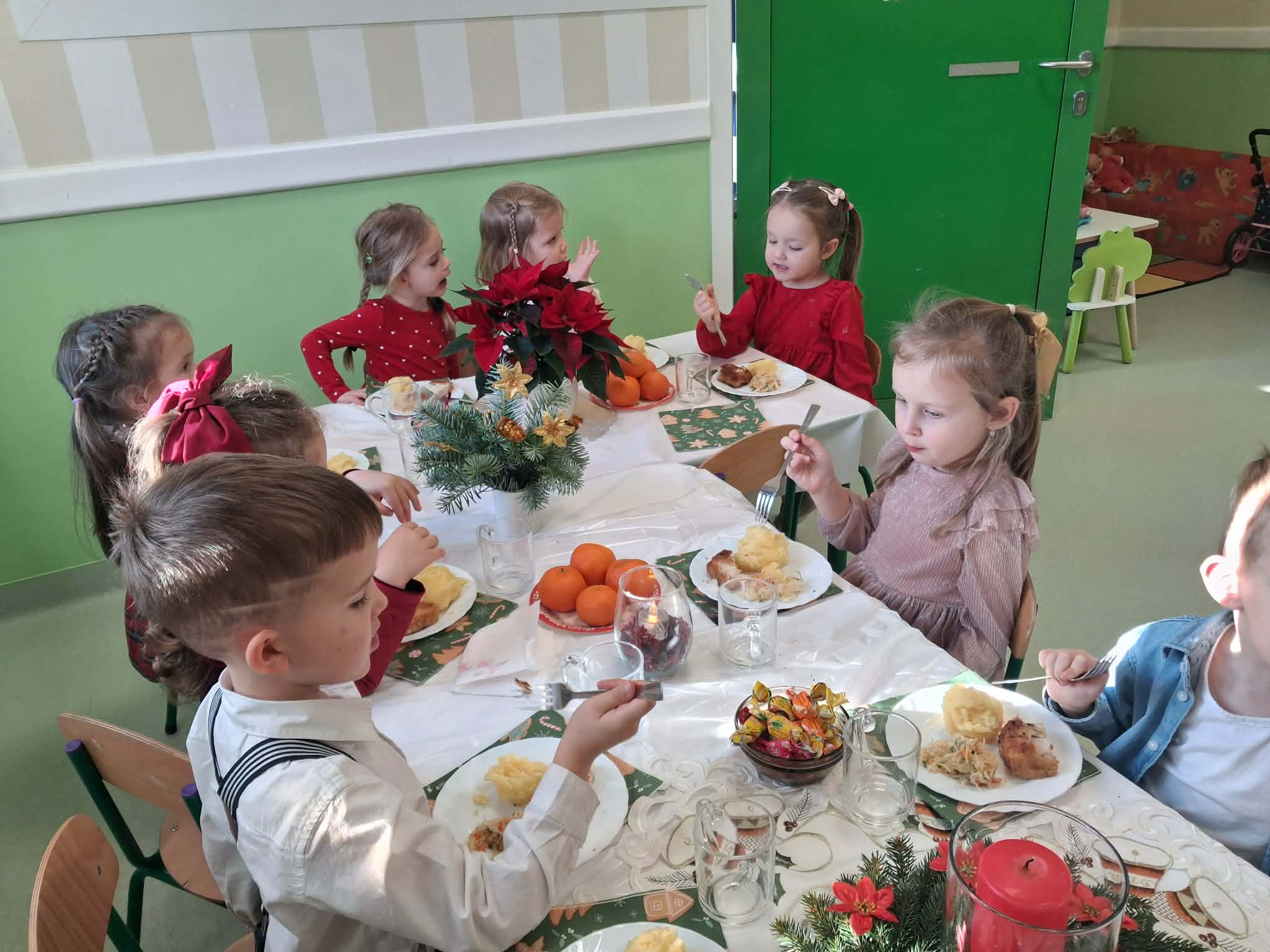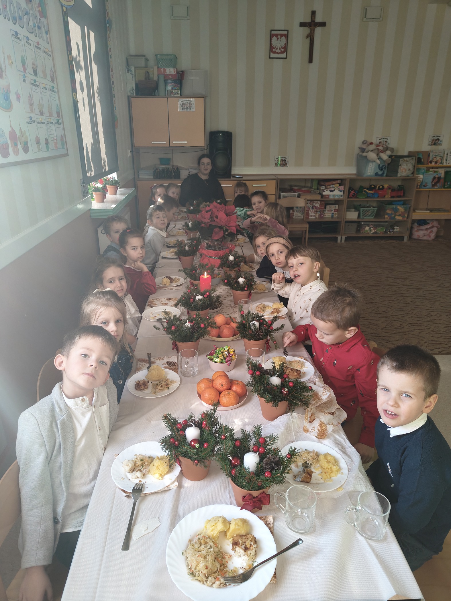 W piątek 19 grudnia odbyła się w naszym przedszkolu Wigilia. Święta Bożego Narodzenia to magiczny czas. Także w naszym przedszkolu nastał wspaniały moment- Wigilia, Boże Narodzenie! Dzieci wspólnie z Paniami kolędowały, składały sobie życzenia i jadły wspólny świąteczny obiad przy pięknie udekorowanym stole. Dzieci zajadały tradycyjny barszczyk i rybkę, ale i nie zabrakło świątecznych ciasteczek i owoców. Takie podniosłe chwile nie tylko utrwalają dzieciom znajomość tradycji i zwyczajów świątecznych lecz również, co najważniejsze wzmacniają bliskie serdeczne relacje. M.Marks