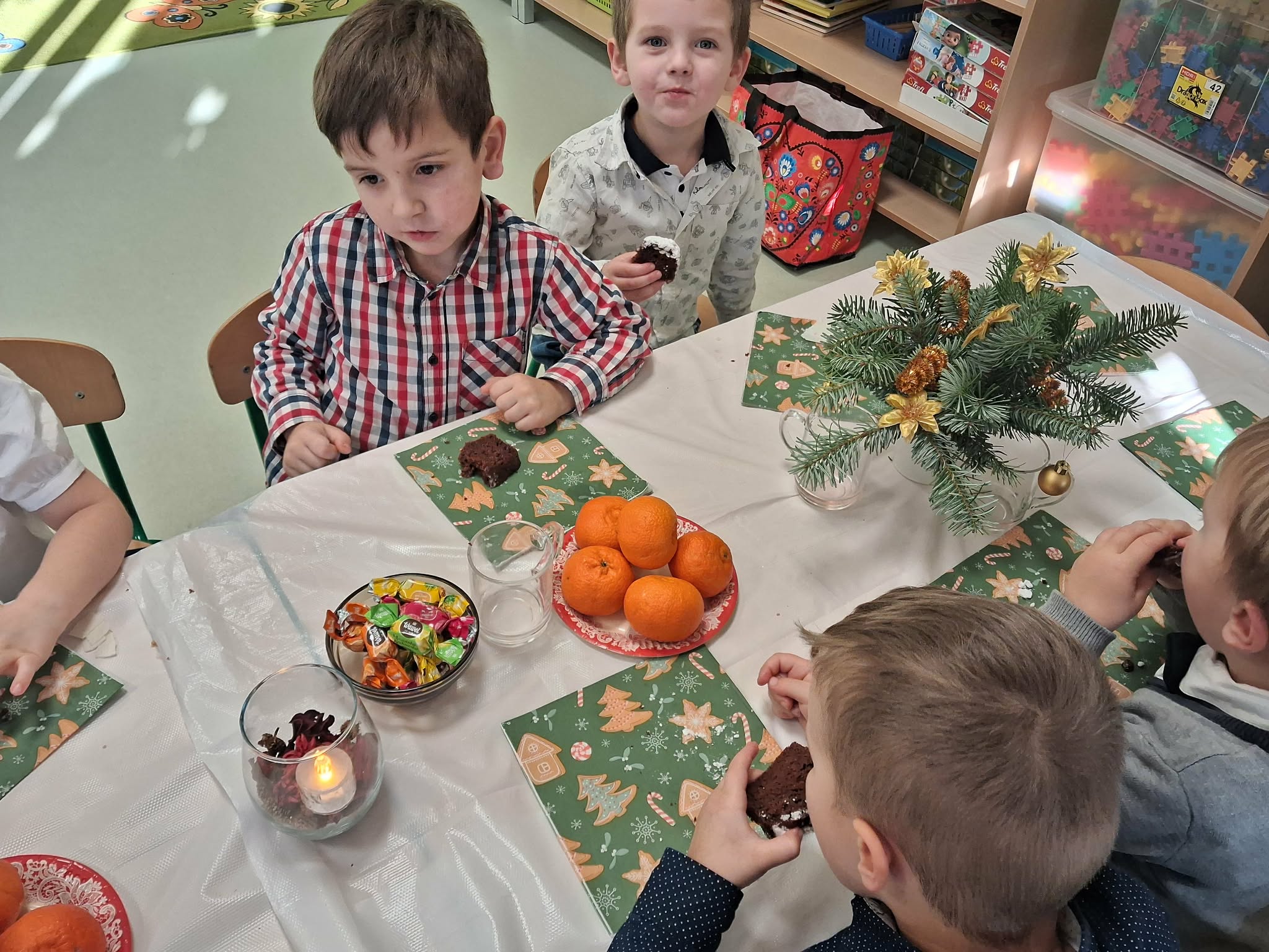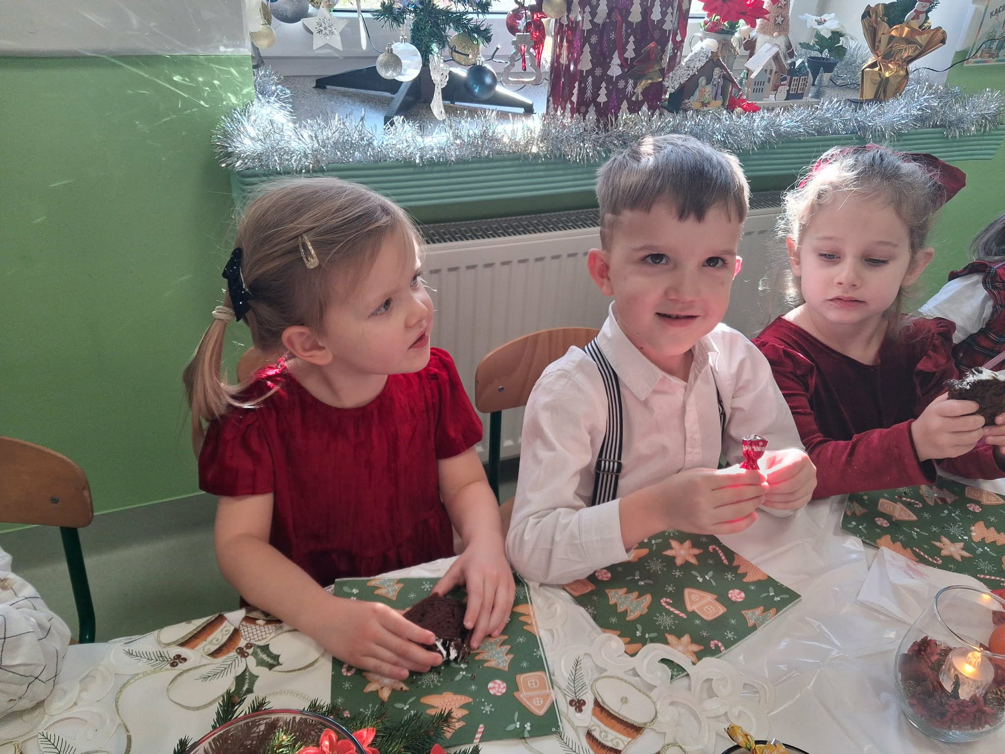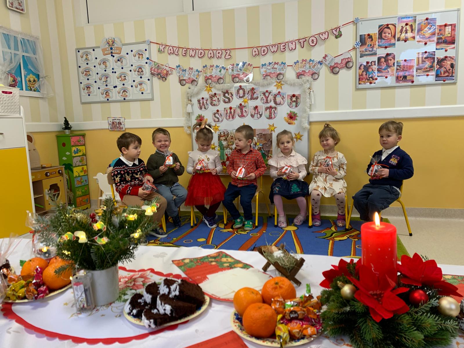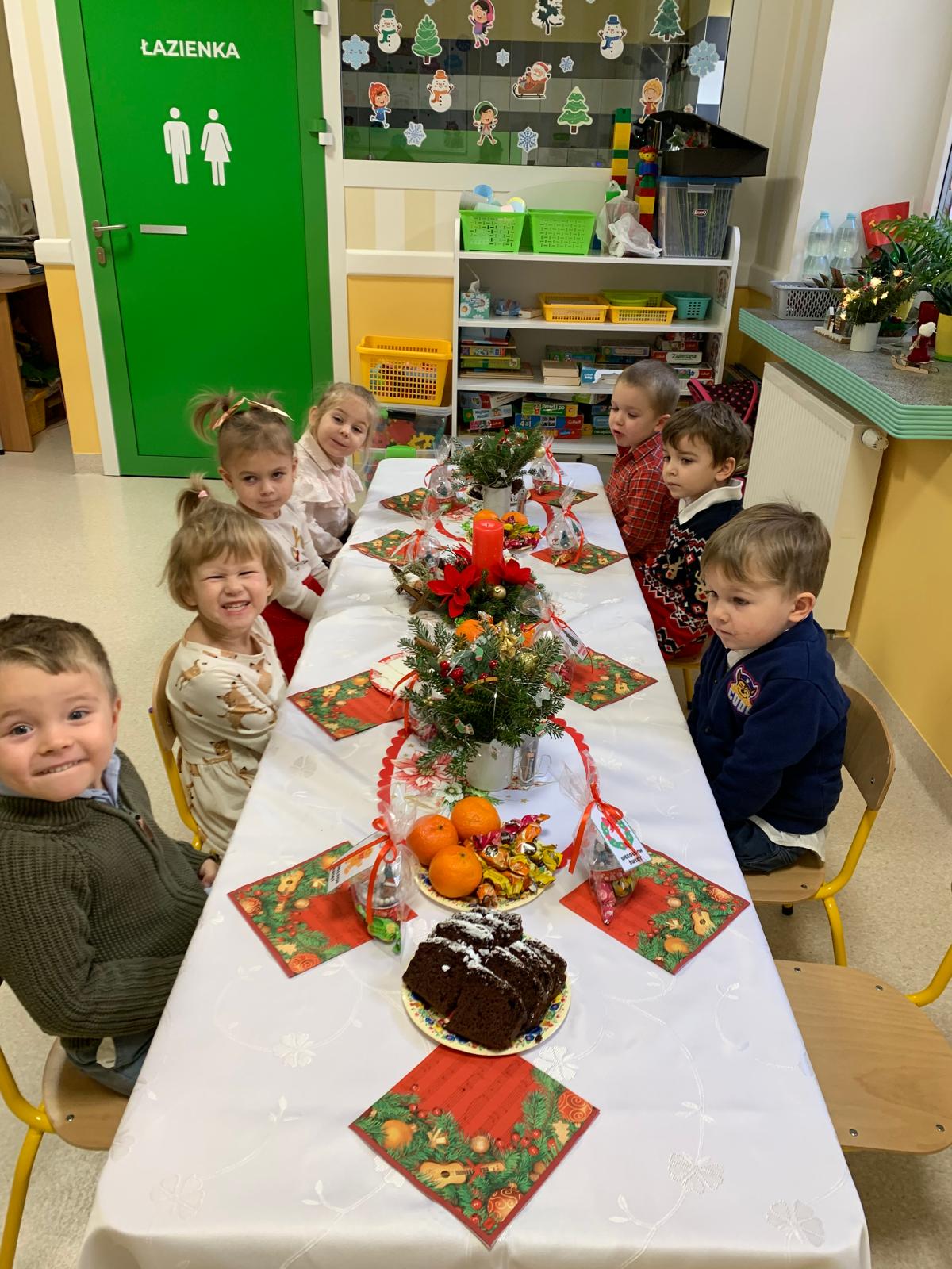 W piątek 19 grudnia odbyła się w naszym przedszkolu Wigilia. Święta Bożego Narodzenia to magiczny czas. Także w naszym przedszkolu nastał wspaniały moment- Wigilia, Boże Narodzenie! Dzieci wspólnie z Paniami kolędowały, składały sobie życzenia i jadły wspólny świąteczny obiad przy pięknie udekorowanym stole. Dzieci zajadały tradycyjny barszczyk i rybkę, ale i nie zabrakło świątecznych ciasteczek i owoców. Takie podniosłe chwile nie tylko utrwalają dzieciom znajomość tradycji i zwyczajów świątecznych lecz również, co najważniejsze wzmacniają bliskie serdeczne relacje. M.Marks