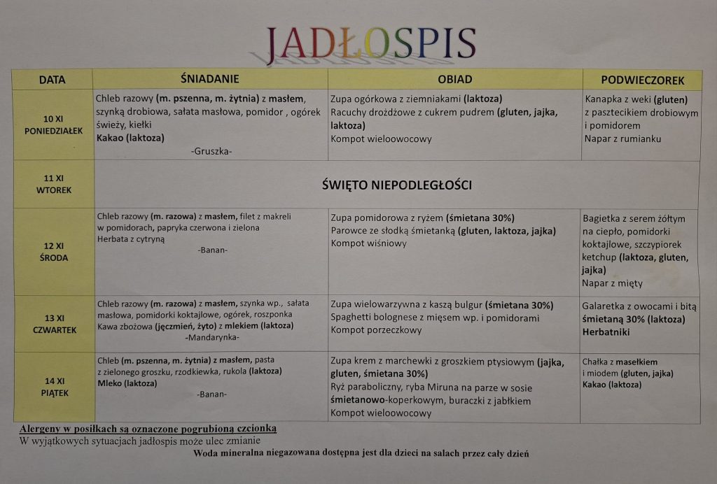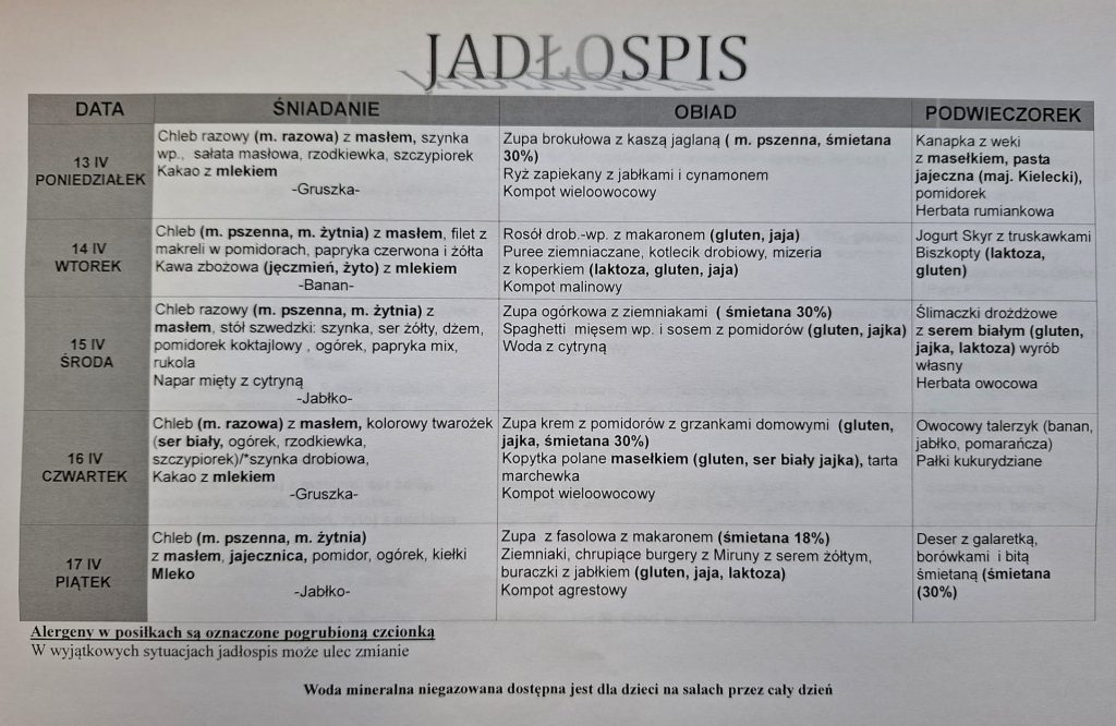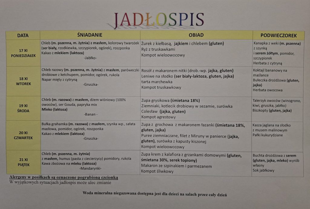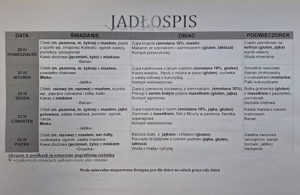 INFORMACJE O OBECNOŚCI POSZCZEGÓLNYCH ALERGENÓW PODAWANE BĘDĄ W CODZIENNYM JADŁOSPISIE.