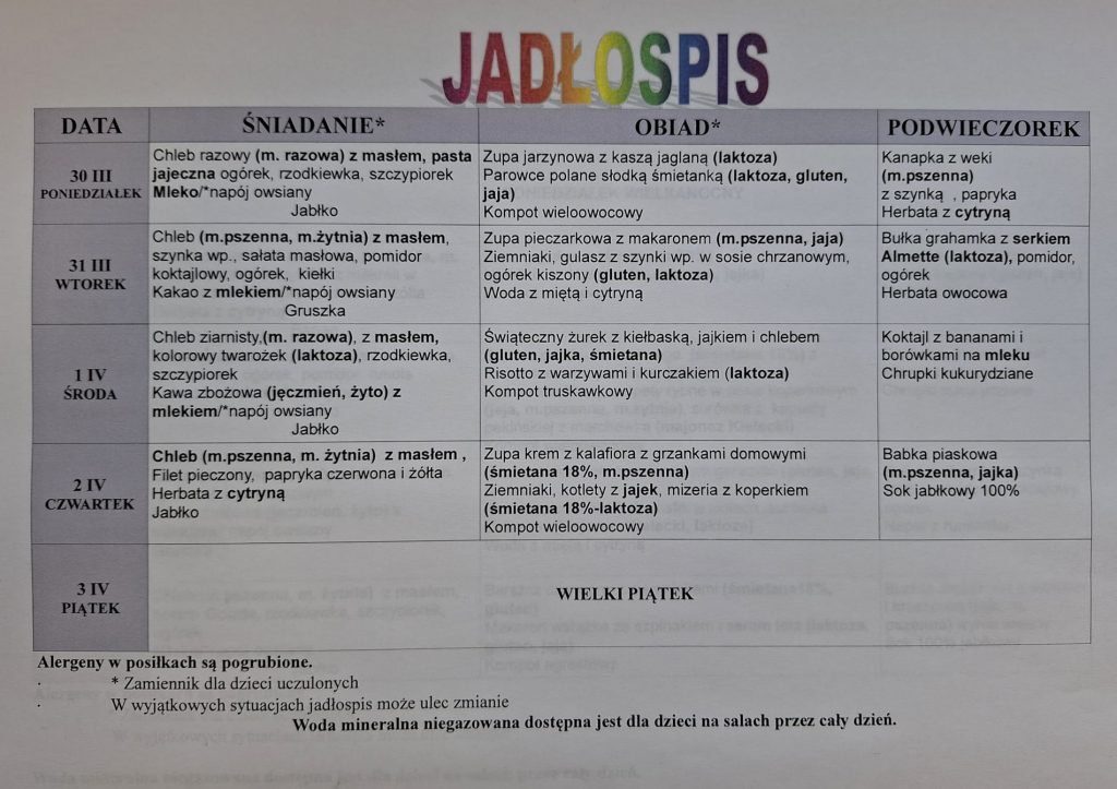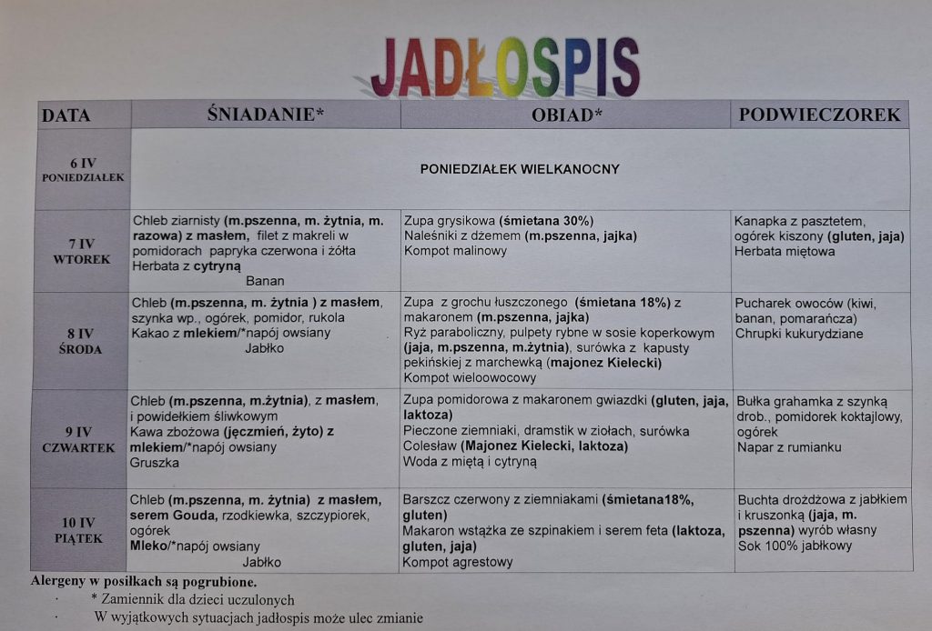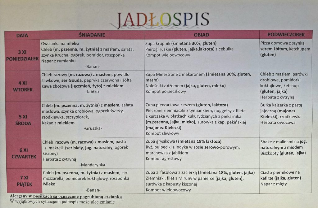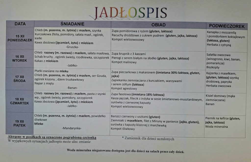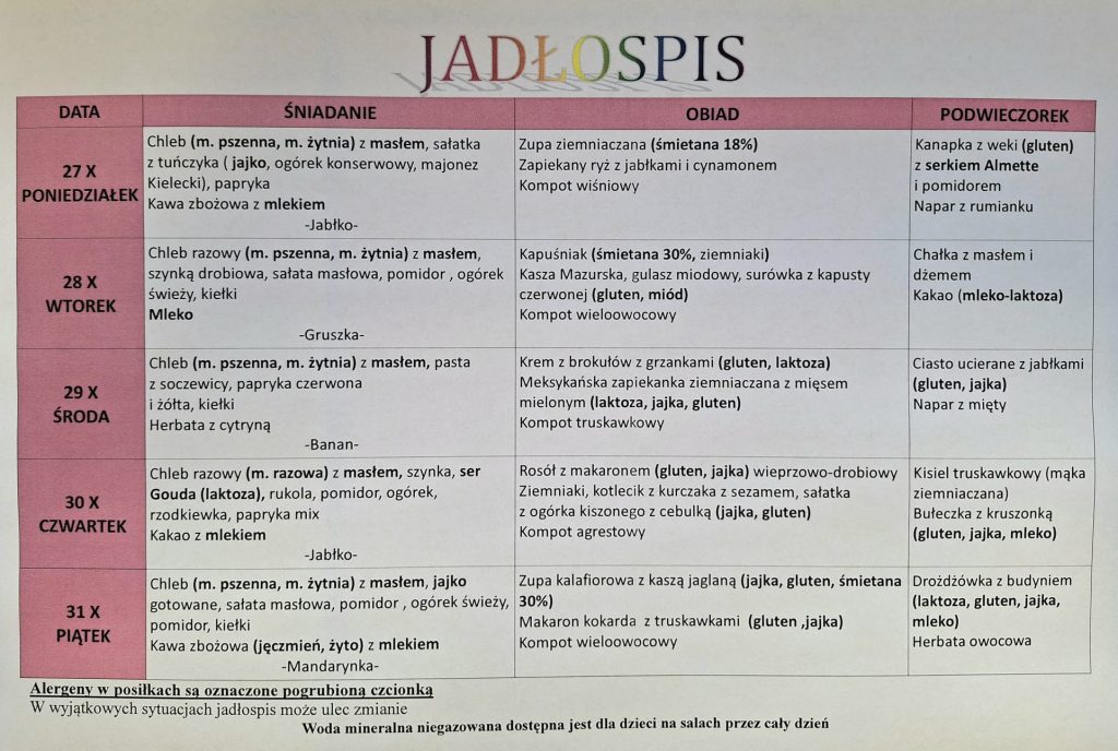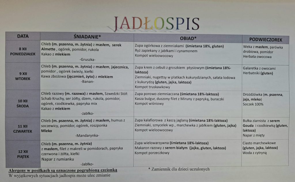 INFORMACJE O OBECNOŚCI POSZCZEGÓLNYCH ALERGENÓW PODAWANE BĘDĄ W CODZIENNYM JADŁOSPISIE.