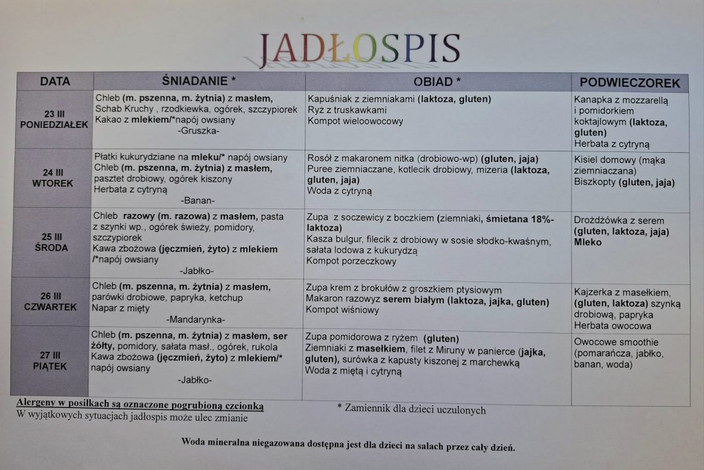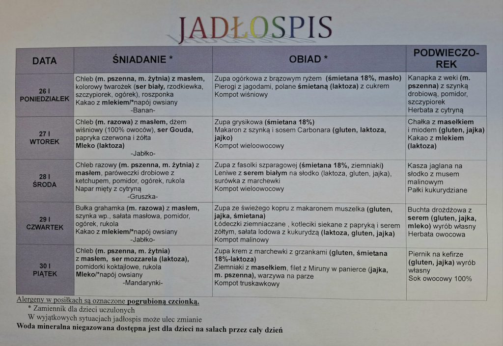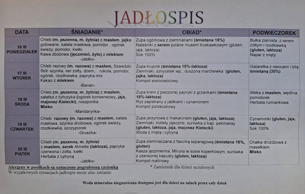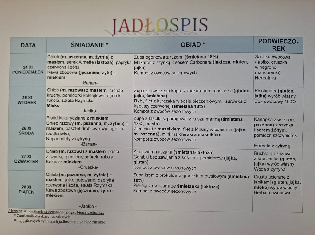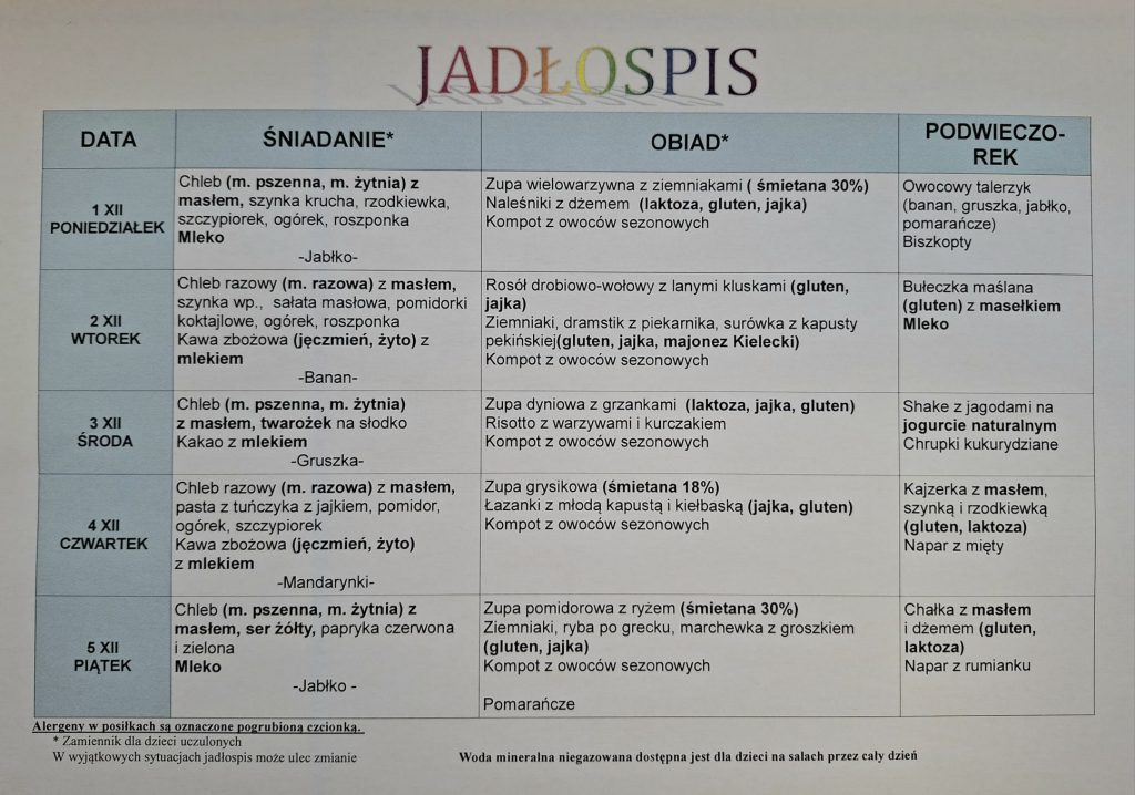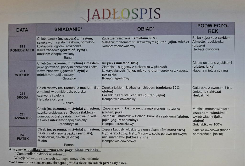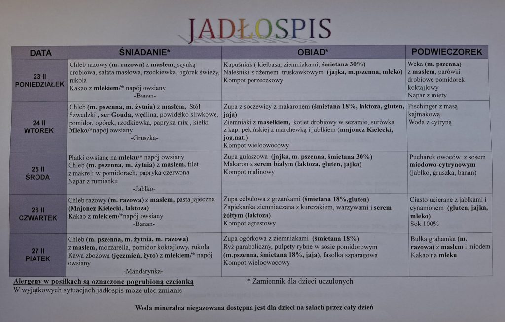 INFORMACJE O OBECNOŚCI POSZCZEGÓLNYCH ALERGENÓW PODAWANE BĘDĄ W CODZIENNYM JADŁOSPISIE.