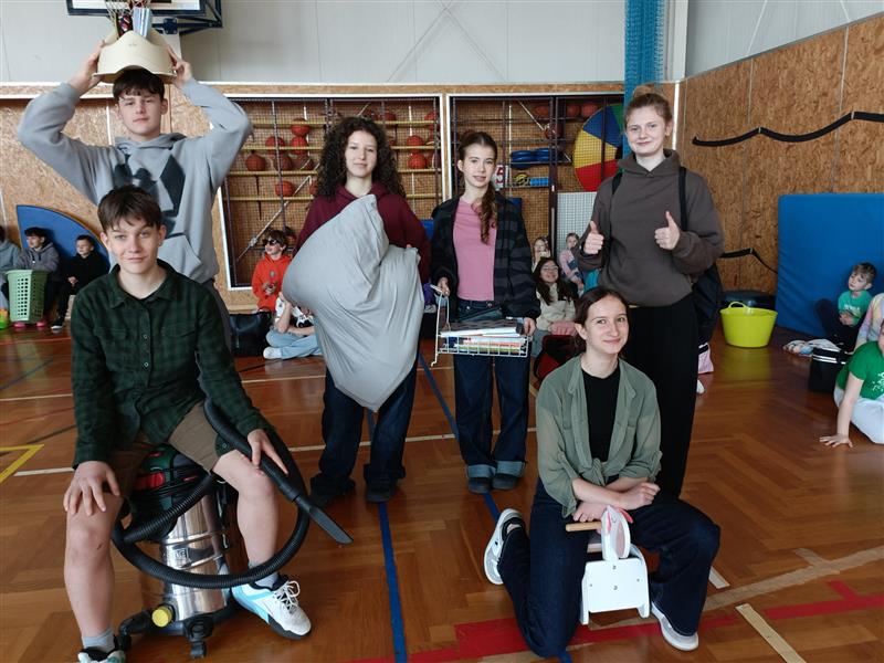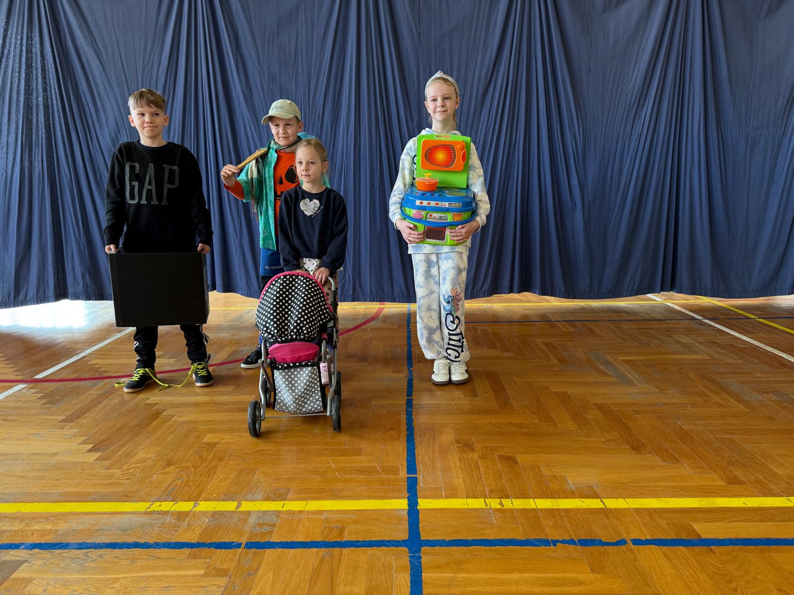 W ciepły marcowy poranek niemal wszyscy uczniowie przybyli do szkoły z wyjątkowymi akcesoriami. Zamiast plecaków każdy przygotował zastępczy materiał na podręczniki i zeszyty, były wiec skrzynki narzędziowe, odkurzacze, koszyki, garnki na rosół, odzież i wiele innych. Przeprowadzono więc szybki Konkurs na najbardziej oryginalny ,,tornister”. Komisja Konkursowa przyznała w klasach I-III: